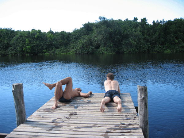 Man sollte grundsätzlich in stehenden Gewässern des Pantanal nicht baden. Wenn, dann nur in Flüssen, und auch da sollte man sich genau erkundigen.