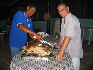 Hier wird das Frühstück, mit meist selbst gebackene Brötchen und das Mittagsessen, draussen unter diesem Palmen-Pavillon serviert.